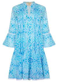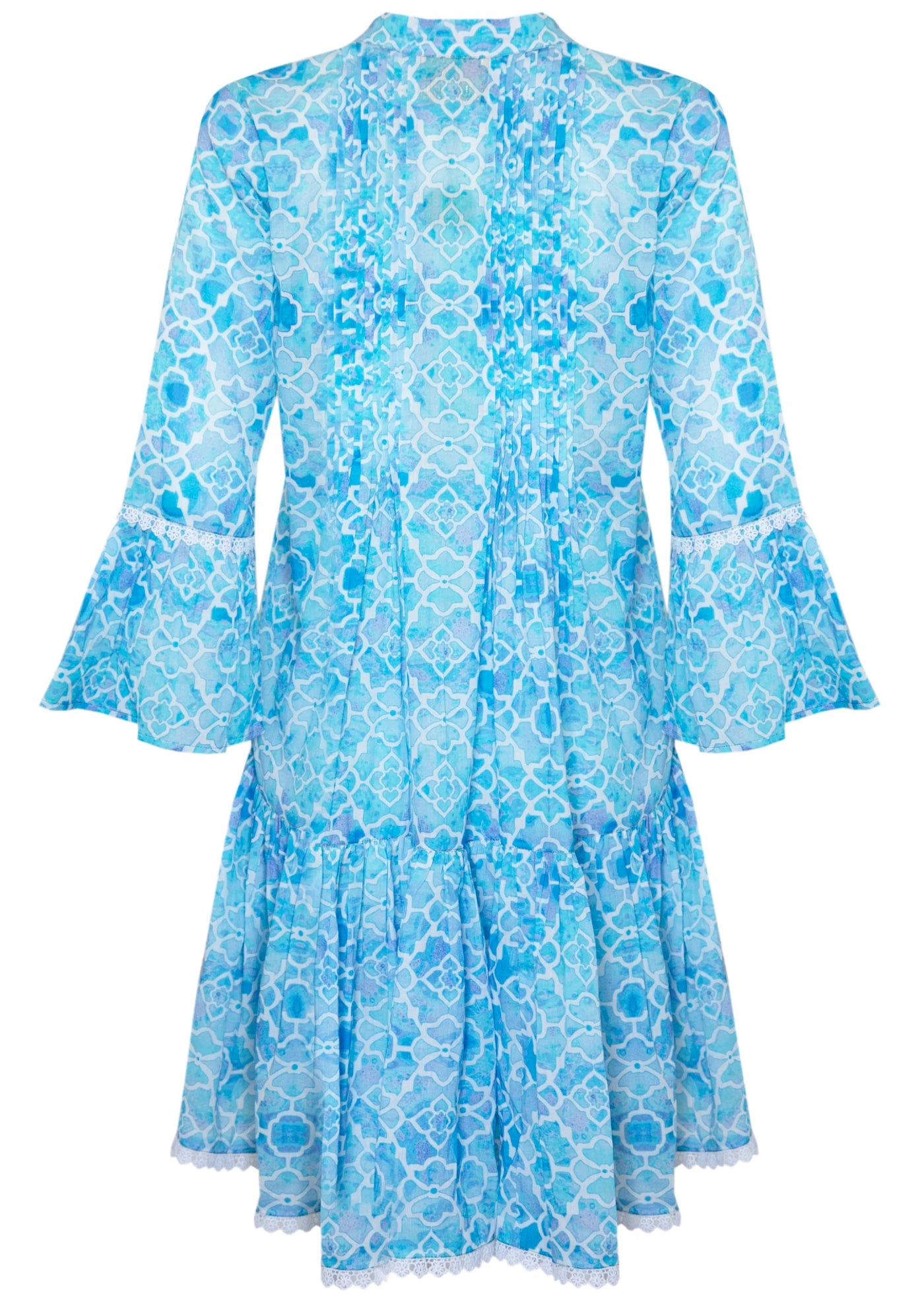 Effortless summer outfits with this 100% cotton A-line shirt dress, featuring a V-neckline, flowing flared sleeves, and tiered hem with white embroidered accents. Designed to transition from day to night with understated elegance.